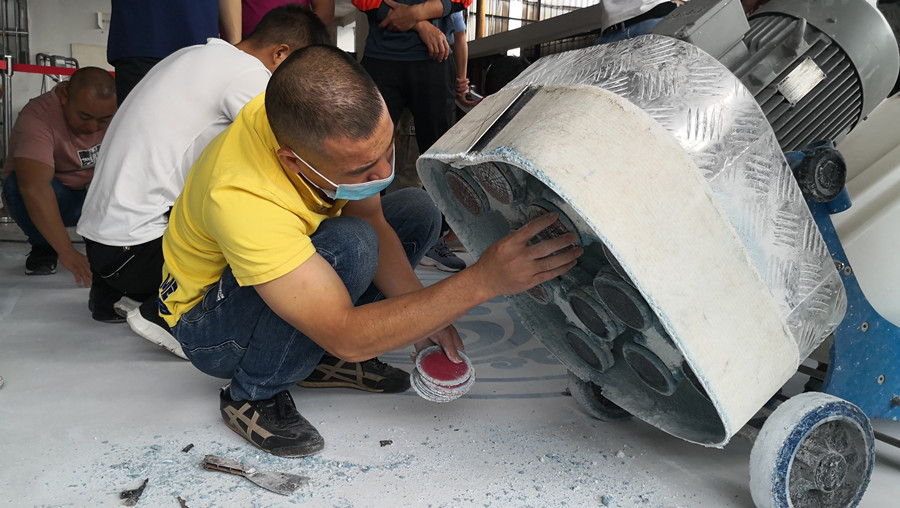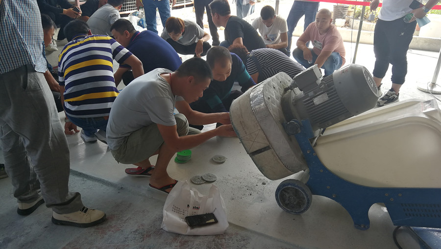 第一塊樣板攤鋪完成后,龔老師及工作人員帶領(lǐng)學(xué)員認(rèn)真研磨,修復(fù)拋光第二塊樣板,手把手教同學(xué)們操作研磨機(jī)、晶面機(jī)等機(jī)器。對于學(xué)員在研磨、修復(fù)、拋光等過程中提出的問題,龔老師為大家一一進(jìn)行了詳細(xì)解答。在看到研磨拋光后的磨石樣板由鏡面效果初顯到像鏡子一樣反光時(shí),學(xué)員都覺得十分神奇,感嘆不虛此行。