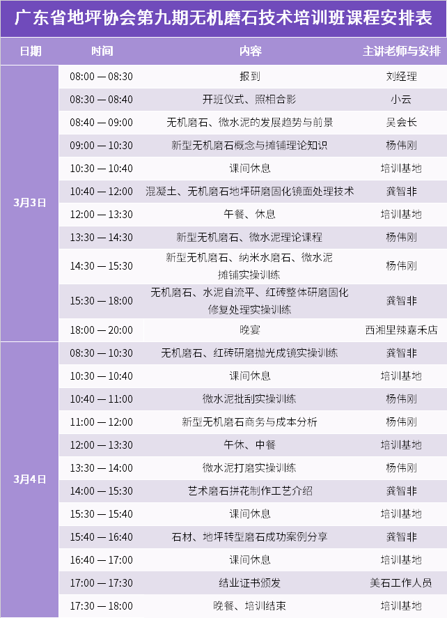 【培訓(xùn)通知】2023.3.3廣東省地坪協(xié)會第九期無機(jī)磨石微水泥施工技術(shù)培訓(xùn)通知